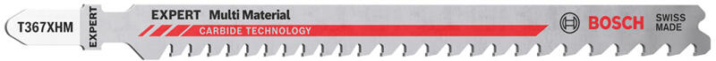 EXPERT Multi Material thick and thin T367XHM szúrófűrészlap – SzúrófűrészekhezAkár 50x hosszabb élettartamot biztosít, mint a Bosch T345XF fűrészlap Többféle építőanyag vágásához hosszú élettartammal A Bosch Carbide Technology kiemelkedő tartósságot biztosít Fokozatos fogosztás különböző vastagságú anyagok vágásához Minden T befogószárú szúrófűrészhez használható Többféle építőanyag vágásához hosszú élettartammal 1 A Bosch Carbide Technology kiemelkedő tartósságot biztosít 2...