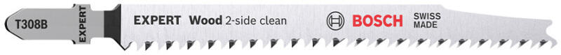 Very clean finish top and bottom - A szúrófűrésszel készített vágás „tiszta oldalának biztosítása a munkaanyag látható részén mindig is művészet volt az ácsok és asztalosok körében. Néha meg lehet fordítani a munkadarabot, máskor magát a szúrófűrészt lehet fejjel lefelé tartani. De használhatja az EXPERT 'Wood 2-side clean' szúrófűrészlapot is, amely kétsoros fogazatának köszönhetően tökéletesen szakadásmentes vágást biztosít mindkét oldalon. Ezeknek a szúrófűrészlapoknak a zseniális kialakítása jóvoltából nincs szükség további munkára a vágás után – sem a fel-, sem a lefelé irányuló löketeknél nem szakítanak. Ez tökéletes azon szakembereknek, akik időt szeretnének megtakarítani, miközben ügyfeleik számára a legmagasabb színvonalú munkát kívánják biztosítani. Extra éles, precíziós csiszolású fogaival a Bosch EXPERT 'Wood 2-side clean' szúrófűrészlap kiválóan alkalmas akár 50 mm vastag puhafa vágására. A szekrénykészítők tökéletes felületet érhetnek el, és nem veszítenek időt a csiszolással a szúrófűrésszel végzett minden egyes vágás után. Kapható egyenes vágásokhoz (T308B), íves vágásokhoz (T308BO) és pontos szögű vágásokhoz (T308BP) Minden T befogószárú szúrófűrészhez használható