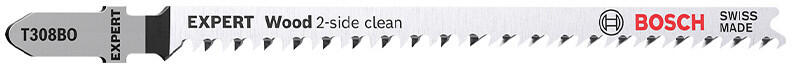 Very clean finish top and bottom - A szúrófűrésszel készített vágás „tiszta oldalának biztosítása a munkaanyag látható részén mindig is művészet volt az ácsok és asztalosok körében. Néha meg lehet fordítani a munkadarabot, máskor magát a szúrófűrészt lehet fejjel lefelé tartani. De használhatja az EXPERT 'Wood 2-side clean' szúrófűrészlapot is, amely kétsoros fogazatának köszönhetően tökéletesen szakadásmentes vágást biztosít mindkét oldalon. Ezeknek a szúrófűrészlapoknak a zseniális kialakítása jóvoltából nincs szükség további munkára a vágás után – sem a fel-, sem a lefelé irányuló löketeknél nem szakítanak. Ez tökéletes azon szakembereknek, akik időt szeretnének megtakarítani, miközben ügyfeleik számára a legmagasabb színvonalú munkát kívánják biztosítani. Extra éles, precíziós csiszolású fogaival a Bosch EXPERT 'Wood 2-side clean' szúrófűrészlap kiválóan alkalmas akár 50 mm vastag puhafa vágására. A szekrénykészítők tökéletes felületet érhetnek el, és nem veszítenek időt a csiszolással a szúrófűrésszel végzett minden egyes vágás után. Available for straight cuts (T308B), for curve cuts (T308BO) and for accurate angle cuts (T308BP) Minden T befogószárú szúrófűrészhez használható