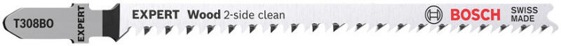 Very clean finish top and bottom - A szúrófűrésszel készített vágás „tiszta oldalának biztosítása a munkaanyag látható részén mindig is művészet volt az ácsok és asztalosok körében. Néha meg lehet fordítani a munkadarabot, máskor magát a szúrófűrészt lehet fejjel lefelé tartani. De használhatja az EXPERT 'Wood 2-side clean' szúrófűrészlapot is, amely kétsoros fogazatának köszönhetően tökéletesen szakadásmentes vágást biztosít mindkét oldalon. Ezeknek a szúrófűrészlapoknak a zseniális kialakítása jóvoltából nincs szükség további munkára a vágás után – sem a fel-, sem a lefelé irányuló löketeknél nem szakítanak. Ez tökéletes azon szakembereknek, akik időt szeretnének megtakarítani, miközben ügyfeleik számára a legmagasabb színvonalú munkát kívánják biztosítani. Extra éles, precíziós csiszolású fogaival a Bosch EXPERT 'Wood 2-side clean' szúrófűrészlap kiválóan alkalmas akár 50 mm vastag puhafa vágására. A szekrénykészítők tökéletes felületet érhetnek el, és nem veszítenek időt a csiszolással a szúrófűrésszel végzett minden egyes vágás után. Available for straight cuts (T308B), for curve cuts (T308BO) and for accurate angle cuts (T308BP) Minden T befogószárú szúrófűrészhez használható