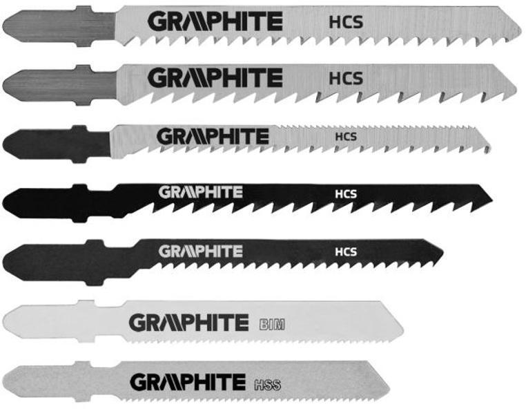 A Graphite szúrófűrészlap készletben 10 db, különféle anyagok vágására szolgáló penge található. Fa vágására 8 fűrészpenge (nagyoló, pontos, valamint íves vágáshoz), 1 penge fém vágására, 1 pedig univerzális, fához és fémhez is. Mindegyik penge népszerű T típusú befogású, így használhatók a piacon kapható szúrófűrészek többségében.