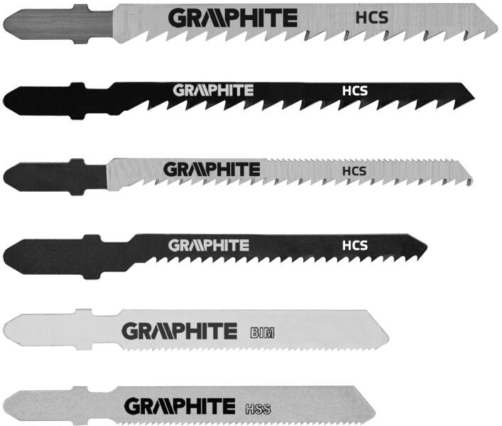 A GRAPHITE szúrófűrészlap készletben különféle anyagok vágására szolgáló lapok találhatók. Fa vágására 4 fűrészlap (nagyoló, pontos, valamint íves vágáshoz), 1 lap fém vágására, 1 pedig univerzális, fához és fémhez is. Mindegyik lap népszerű T típusú befogású, így használhatók a piacon kapható szúrófűrészek többségében. EAN: 5902062577542VTSZ: 8202998000