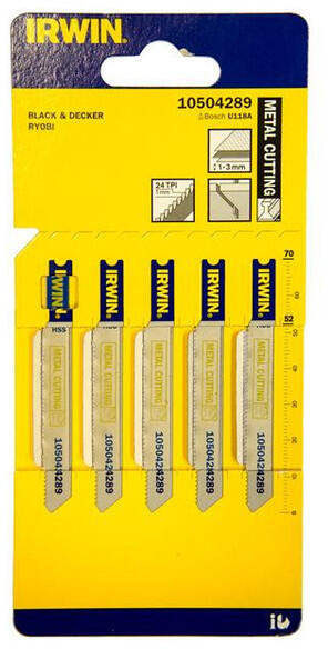IRWIN Fémvágó HSS dekopírfűrészlapok – U-szárHSS mart fogak a hosszabb élettartam és a fém gyors vágása érdekébenHosszabb élettartam vékony és vastag fém gyors és egyenletes vágásáhozA dekopírfűrészlapok teljes körű kínálata minden alkalmazáshoz tartalmaz fűrészlapot. Az IRWIN dekopírfűrészlapok az alábbi kiváló minőségű anyagokból készülnek: HSS teljesen edzett gyorsacél fémhez, alumíniumhoz és nemvasfémhez. Technikai adatok: Hosszúság:70 mmFogsűrűség:24TPIFűrészlap befogó:U118AAnyaga:HSS